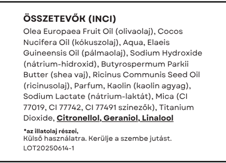 Olea Europaea Fruit Oil (olívaolaj), Cocos Nucifera Oil (kókuszolaj), Aqua (víz), Elaeis Guineensis Oil (pálmaolaj), Sodium Hydroxide (nátrium-hidroxid), Butyrospermum Parkii Butter (shea vaj), Ricinus Communis Seed Oil (ricinusolaj), Parfum, Kaolin (kaolin agyag), Sodium Lactate (nátrium-laktát), Mica (CI 77019, CI 77742, CI 77491 színezők), Titanium Dioxide, Citronellol*, Geraniol*, Linalool*